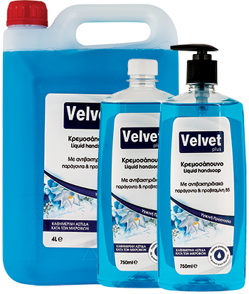 The Velvet Plus line offers complete personal care with a focus on hygiene and protection. Each product combines mild antiseptic action with moisturizing and softening agents, providing a lasting feeling of cleanliness and freshness. Enriched with provitamin B5 and natural aloe juice, they respect the skin and keep it protected every day.