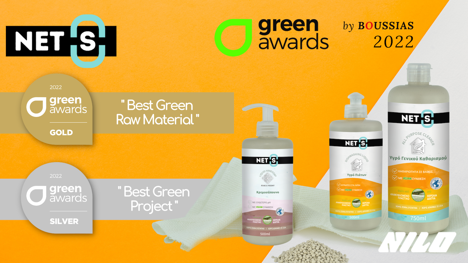 NILO received a double distinction at the Green Awards 2022, earning a Gold award in the category “Best Green Raw Material” and a Silver award in the category “Best Green Project” for its ecological household and personal care product line NET(S). The line aims to reduce CO₂ emissions toward a NET ZERO EMISSIONS future, featuring Vegan formulations and packaging made from recycled plastic derived from agricultural plastic waste such as nets, threads, and twines. We would like to sincerely thank Boussias Communications and the judging committee for recognizing and honoring our company, and we extend our congratulations to all the companies that participated and were awarded.