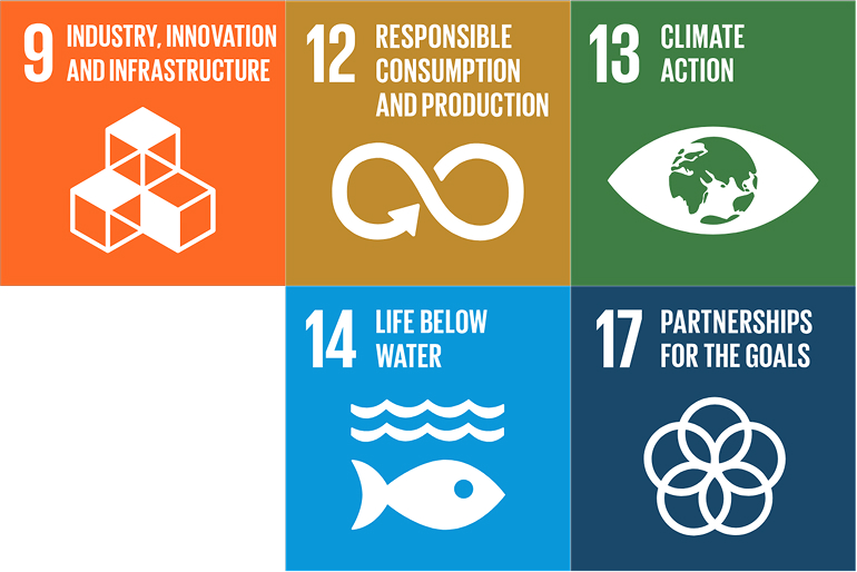 9.Βιομηχανία, καινοτομία και υποδομές, 12.Υπεύθυνη κατανάλωση και παραγωγή, 13.Κλιματική δράση , 14. Προστασία των υδρόβιων οργανισμών, 17.Συνεργασίες για την επίτευξη των παγκόσμιων στόχων για βιώσιμη ανάπτυξη.