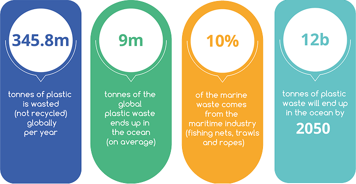 Περίπου το 10% προέρχεται από την αλιευτική και ναυτιλιακή βιομηχανία, δηλαδή δίχτυα αλιείας, σχοινιά, κιβώτια ψαριών κλπ. Οι επιστήμονες προειδοποιούν ότι πάνω από 12 δισεκατ. τόνοι πλαστικού θα καταλήξουν στις θάλασσες και τους ωκεανούς μας έως το 2050, εάν υπάρξει κάποια λύση. Δηλαδή, περισσότερο πλαστικό σε βάρος από ό,τι ψάρια στους ωκεανούς.